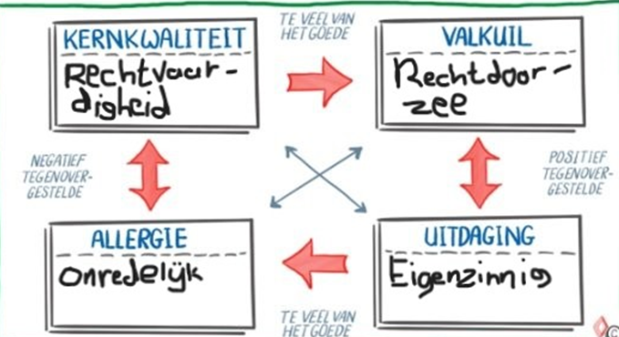 Een van mijn kernkwaliteiten is rechtvaardigheid. Ik vind het zelf heel belangrijk dat mensen gelijk behandeld worden en rechtvaardigheid speelt hier een grote rol bij. Daarom heb ik mijn best gedaan om het hebben van een rechtvaardige instelling onder de knie te krijgen. Als ik dit in een kernkwadrant invul zie je hieronder dat er een aantal andere dingen uitkomen. Zo is te zien dat mijn allergie is dat mensen onredelijk zijn. Ik herken mij hier heel erg in aangezien ik er heel slecht tegen kan als mensen onredelijk doen tegen elkaar of tegen mij.